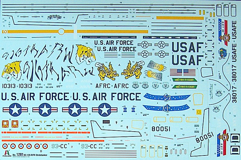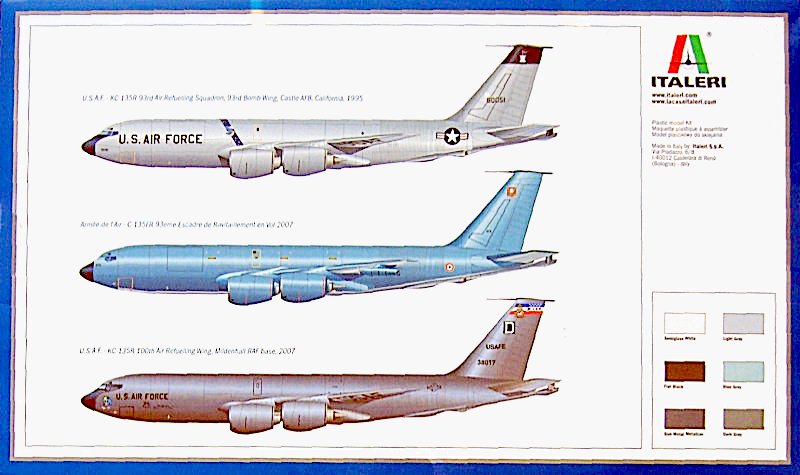 Bausatz: Erfreulicher Weise erschien schon Ende 2003 bei Heller die C-135FR. Es handelt sich um einen modifizierten AMT - Bausatz aus den 90er Jahren, der in dieser Version noch nicht auf dem Markt war. Es wurden noch die Betankungseinrichtungen für die Tragflächen hinzugefügt. Nun hat Italeri diese Version erneut herausgebracht. Um Unterschied zur Heller Auflage gibt es sehr interessantere und aktuellere Bemalungsvarianten.