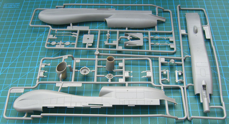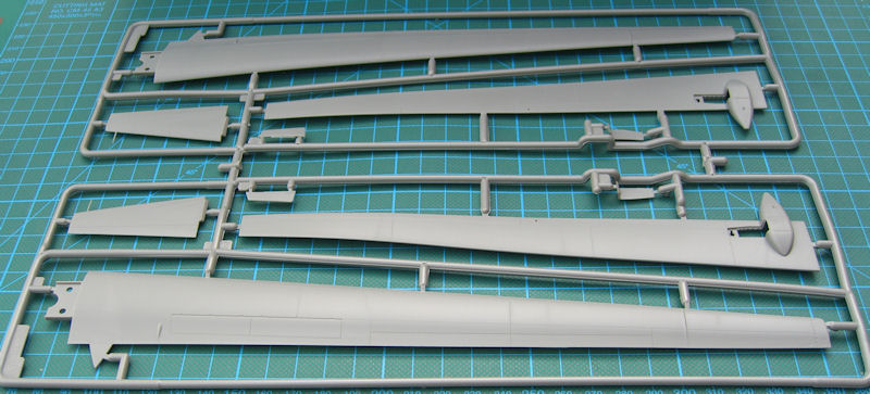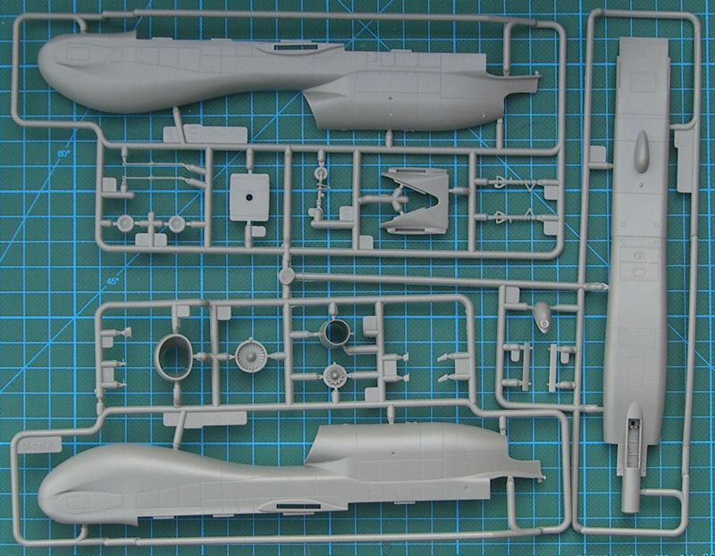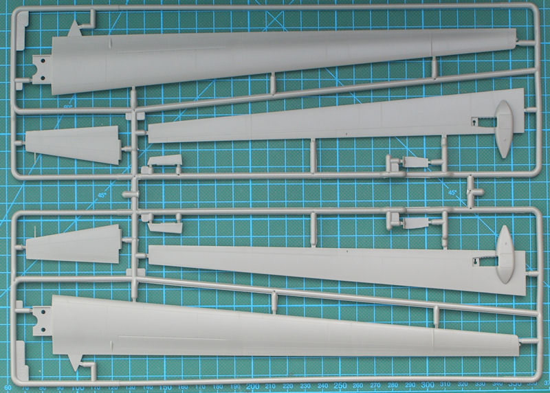 Im praktischen Stülpkarton befinden sich gut verpackt zwei Spritzgussrahmen mit insgesamt 35 Teilen, ein Decalbogen und die Bauanleitung. Die Bauteile haben sehr feine realistische Strukturen. Erste Passungen versprechen einen leichten Bau. Von einem Buggewicht ist nichts in der Bauanleitung zu entdecken. Ich würde es trotzdem einplanen. Die Tragflächen haben enorme Abmaße. Man könnte fasst einen 48er Bausatz vermuten. Bisschen kniffelig könnte das Ausrichten des V-Leitwerks sein, denn eine Frontansicht stellt und Italeri nicht zur Verfügung.