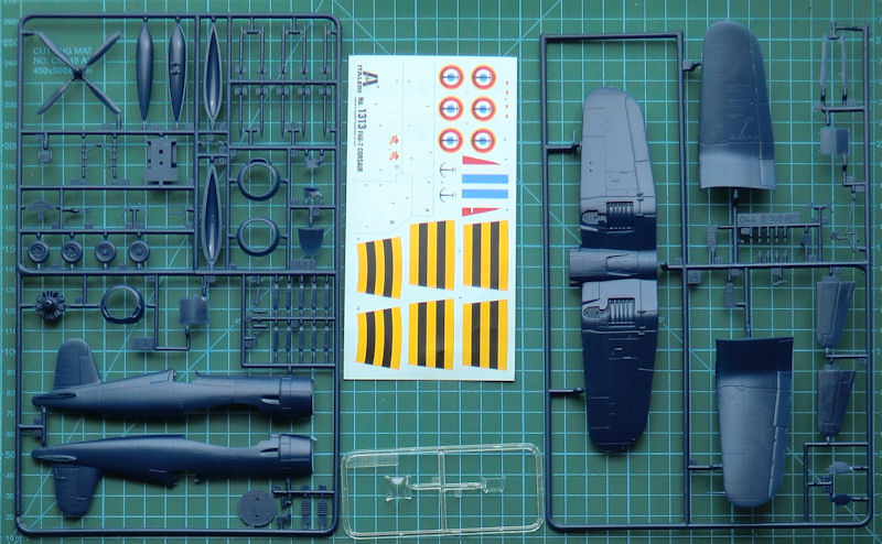 In der attraktiven aber unpraktischen Schüttbox von Italeri befinden sich gut verpackt zwei dunkelblaue Spritzlinge mit 82 Teilen, ein Rahmen mit zwei Klarsichtteilen, ein Decalbogen und die Bauanleitung. Auf der der Rückseite des Kartons befinden sich zwei Bemalungsoptionen.