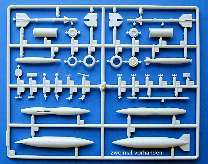 Erfreulicherweise liegen reichlich Bestückungsmöglichkeiten für die Pylone bei. Für die Tips sollte man auf jeden Fall die "Coke-Bottle-Tanks" vorsehen. Dazu gibt es zwei Zusatztanks, 2 Bomben, 2 Behälter für ungelenkte Raketen und zwei Sidewinder-Versionen (je zwei). Der Zubehörmarkt bietet zwar besseres, aber immerhin liegen diese bei.