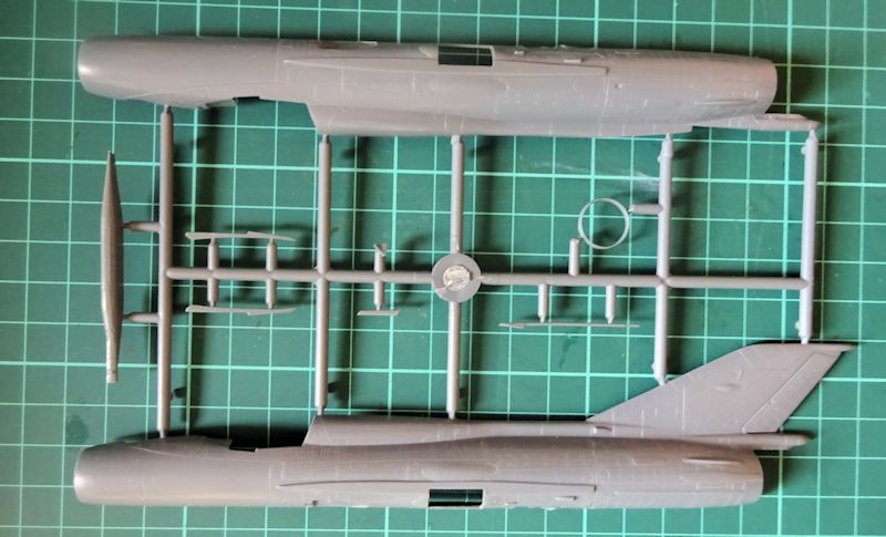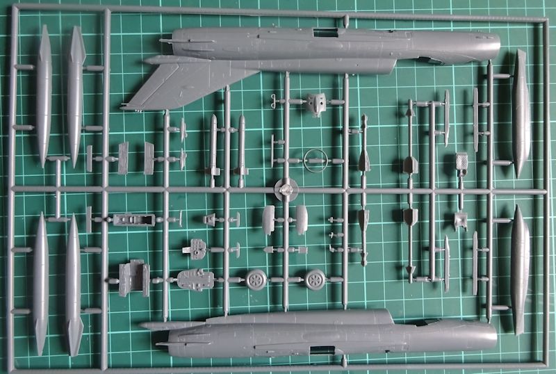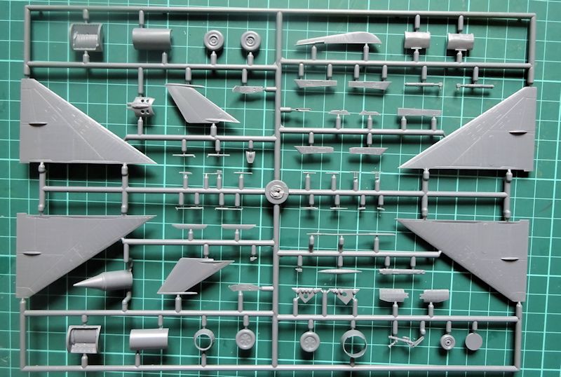 Die Tragflächen und das Höhenleitwerk bestehen aus einem Stück. Hier und bei den anderen Großteilen fallen sofort die zahlreichen Gravuren ins Auge. Inwieweit die große Menge Nieten realistisch ist muss jeder für sich entscheiden. Selbst Eduard geht bei seinen 72er Modellen sparsamer damit um. Die übrigen Teile, wie die Fahrwerkschächte sind stimmig, das Triebwerk hat eine Innengestaltung und die ringförmige Ausführung von Bug und Heck vermeidet hier Nahtstellen, die Konusgestaltung ist gelungen. Hier lässt sich auch problemlos das Gewicht unterbringen. Das Cockpit ist ausreichend detailliert. Positiv finde ich die Sitzgurt-Abziehbilder.