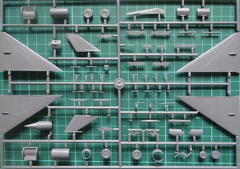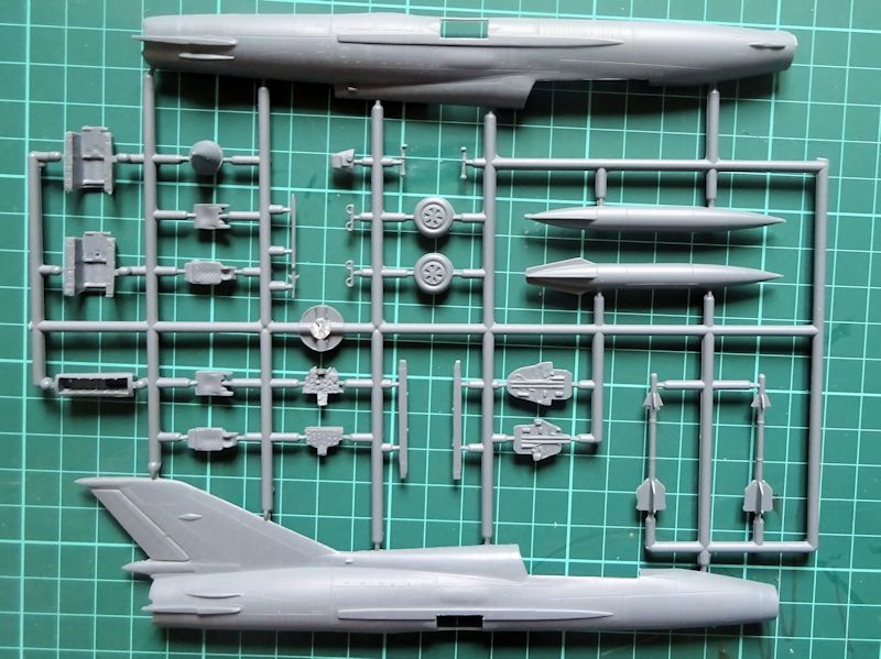 Die Tragflächen und das Höhenleitwerk bestehen aus einem Stück. Hier und bei den anderen Großteilen fallen sofort die zahlreichen Gravuren ins Auge. Inwieweit die große Menge Nieten realistisch ist muss jeder für sich entscheiden. Die übrigen Teile, wie die Fahrwerkschächte sind stimmig, das Triebwerk hat eine Innengestaltung. Das Cockpit ist ausreichend detailliert. Positiv finde ich die Sitzgurt-Abziehbilder. R.V.Aircraft hat auch die bei den anderen MiG fehlenden Zusatzbehälter und Raketen mitgeliefert. Der Lufteinlauf ist etwas dick geraten und sollte daher etwas dünner geschliffen werden.