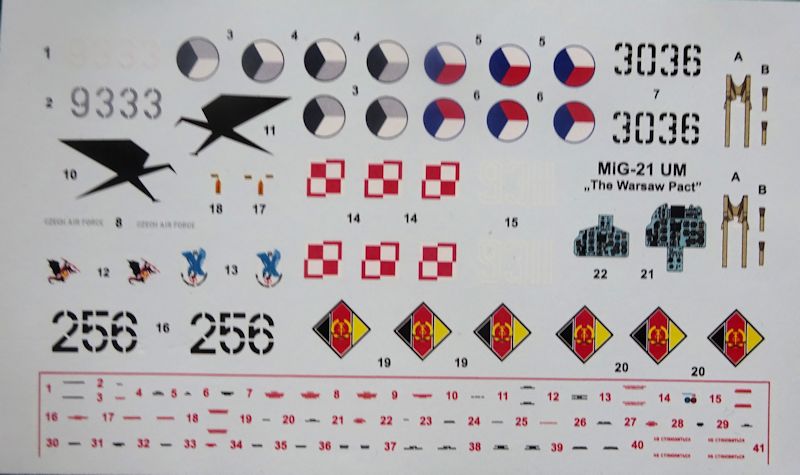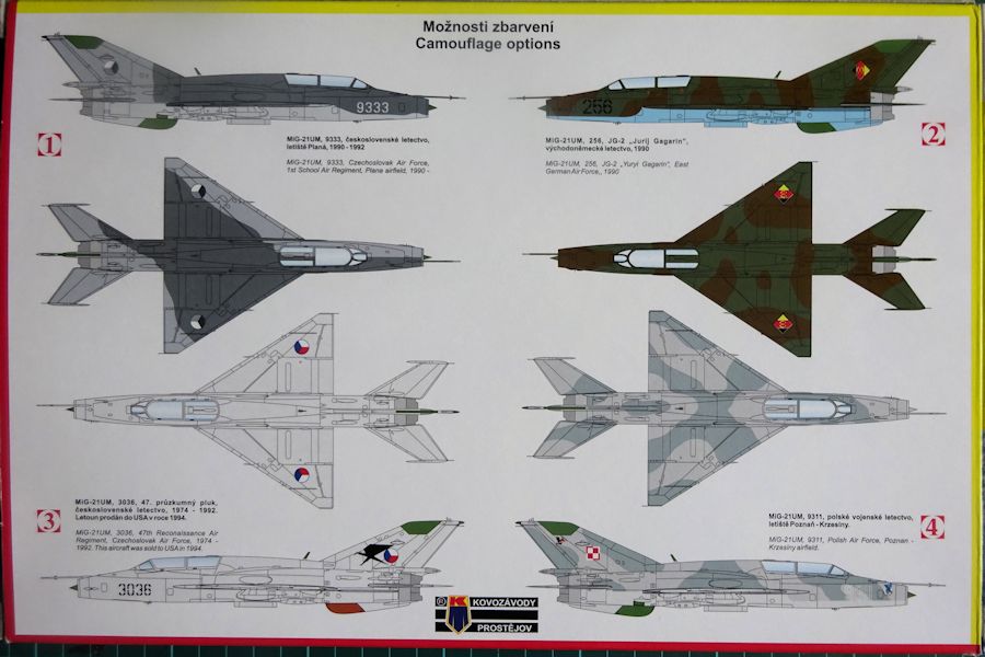 Bausatz: KP bringt im fünfzigsten Jahr seines Bestehens auch die MiG-21UM. Gravuren im Rumpf deuten an, dass das Eigenprodukt mit Teiulen von R.V. Aircraft ergänzt wurde. Die Faltschachtel enthält zwei graue Spritzrahmen mit ca. 70 Teilen sowie dem transparenten mit sechs Teilen, einen Abziehbilderbogen, die mehrfarbige Bemalungs- und eine übersichtliche Bauanleitung. Die Spritzqualität ist durchaus gut, wenngleich einige Details etwas verwaschen daher kommen.
