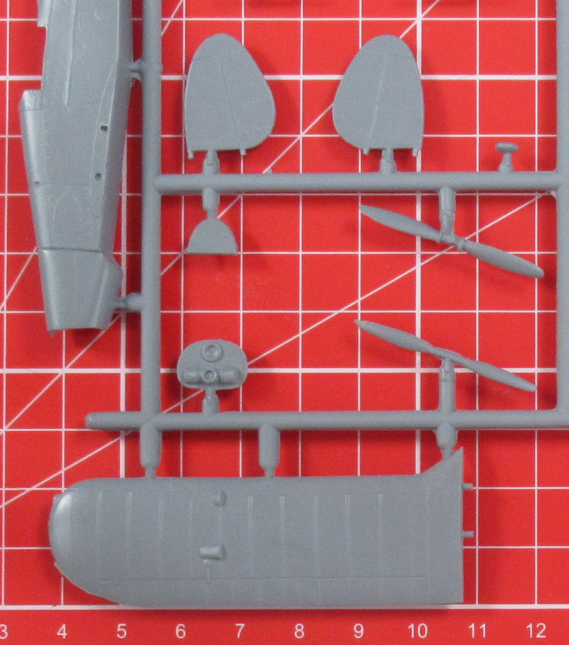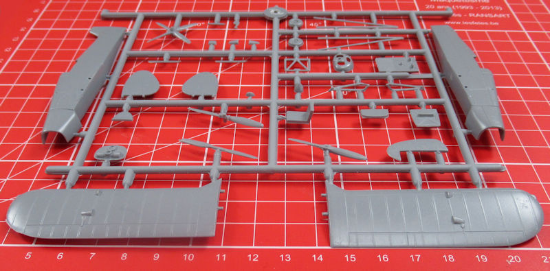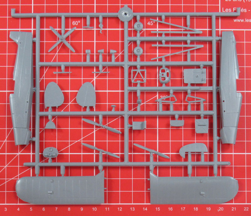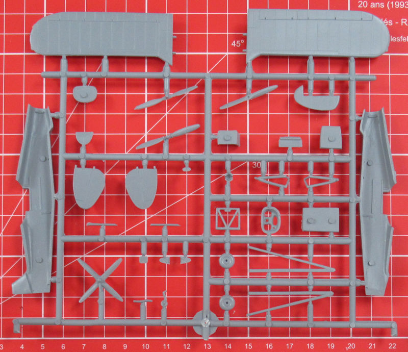 Der Bausatz bietet wenige aber mit einer feinen Oberfläche versehende Bauteile. Das Cockpit entsteht aus acht Teilen. Man muss das Instrumentenbrett bemalen. Leider gibt es die Sitzgurte nicht einmal als Decal. Das ist schade. Der Motor wird unter der Haube nur mit einem Relief angedeutet. Es gibt vier verschiedene Propeller. Leider gehen weder die Bau- noch die Bemalungsanleitung auf die Verwendung näher ein. Eine Frontansicht hilft beim Zusammenbau der Tragfläche.