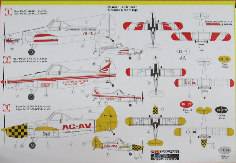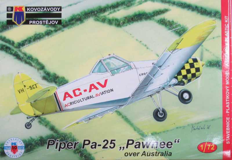 Bausatz: Ein System für die Bausatzauswahl bei Kovozávody Prostéjov konnte ich noch nicht erkennen. Daher hat mich die Piper PA-25 Pawnee im Maßstab 1/72 positiv überrascht. In der attraktiven aber unpraktischen Schüttbox befinden sich gut verpackt ein hellgrauer Spritzgussrahmen mit 34 Teilen, eine klare einteilige Kanzel, ein Decalbogen und die mehrfarbige Bauanleitung.