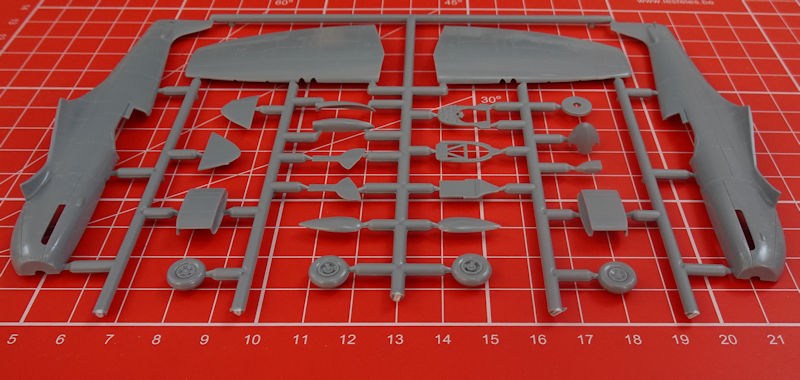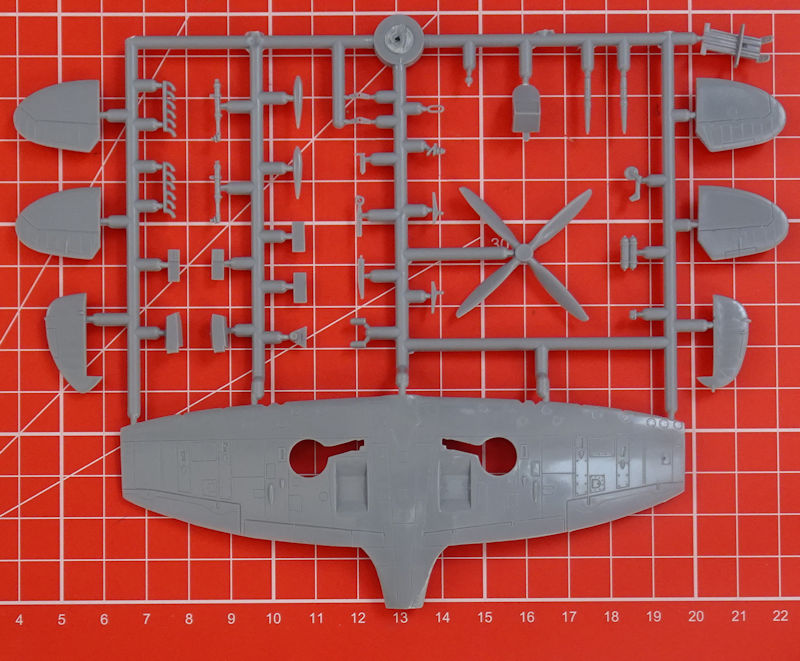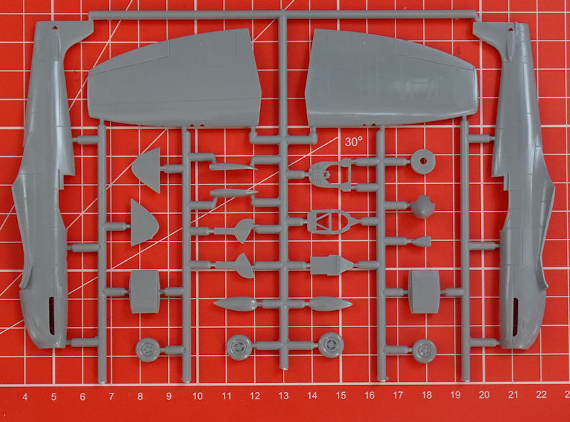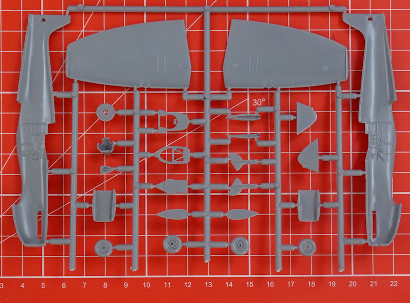 In der attraktiven aber unpraktischen Schüttbox befinden sich gut verpackt zwei graue Spritzlinge mit 64 Teilen, eine Spritzgusskanzel, zwei Decalbögen und die Bauanleitung. Die Aufteilung der Bauteile ist sinnvoll. Es gibt feine versenkte Strukturen und eine Menge optionale Teile. Daher muss jede einzelne Beule auf der Tragflächenoberseite selbst aufgeklebt werden.