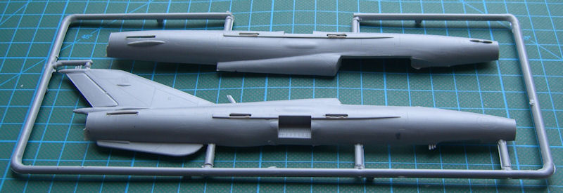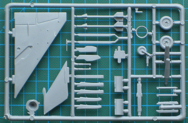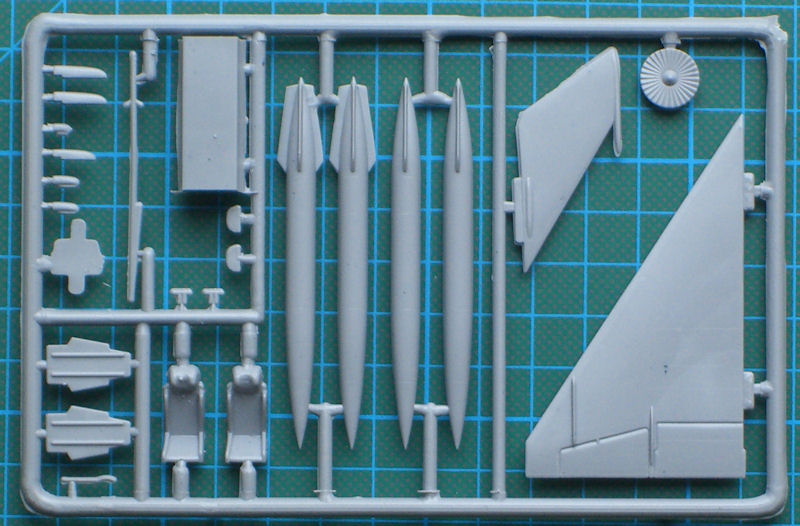 Ansonsten gibt es einen Bausatz der in der Ausstattung solide und stimmig ist. Die Finnen der Zusatztanks sind sehr filigran. Bei den Leitwerken der Raketen muss man einige Abstriche machen. Schön dünn sind auch die Tragflächen- und Leitwerkshinterkanten. Hier haben die Hersteller damals echt mitgedacht. Das Bugfahrwerk ist etwas einfach und einteilig.