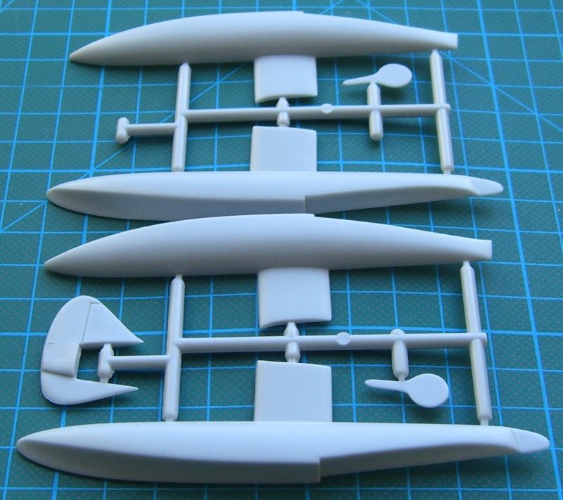 Ein neues Seitenruder ersetzt das ursprüngliche Bausatzteil. Die Fahrwerksschächte werden mit beiliegenden Abdeckklappen verschlossen Die beiden Schwimmer werden nach einer Zeichnung montiert. Markierungen zum Anbringen dieser beiden großen Teile gibt es leider nicht. Dafür hilft aber eine Maßskizze weiter.
