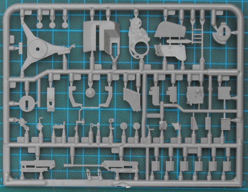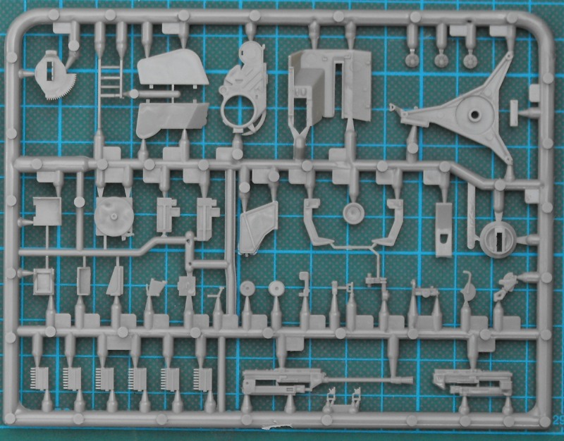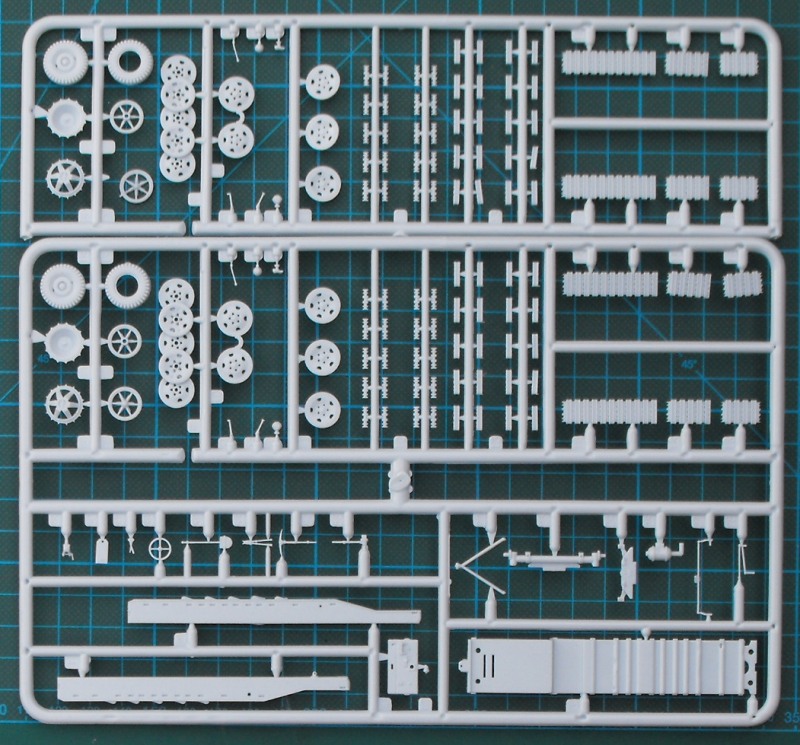 Die Detaillierung ist auf der Höhe der Zeit und entspricht denen der gegenwärtigen Trumpeter oder Revell-Bausätze. Es gibt feine und kleinste Bauteile sowie auch feinste Gravuren/Strukturen. Einige wird es freuen: Es gibt keine Gummikette sondern Segmente und einzelne Kettenglieder aus Spritzgussmaterial. Der Bau beginnt mit der Unterwanne und dem Schachtellaufwerk. Hier ist MACO auf der Höhe der Zeit. Aufgrund der Konstruktion ist aber ein teilweise eingefedertes Fahrwerk nicht baubar. Die Räder bestehen aus zwei Hälften, die dann an der filigranen Vorderachskonstruktion befestigt werden.