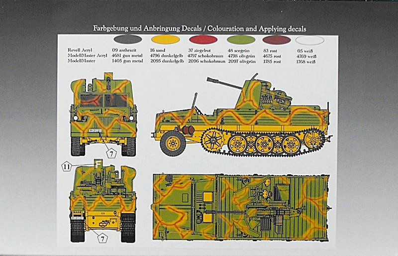 Als Bemalungshinweis dient die Kartonrückseite. Die Farbangaben sind für die Farbsysteme von Revell und ModellMaster. Der kleine Decalbogen ist ohne Versatz auf hellblauem Trägerpapier gedruckt. Leider gibt es keine weiteren Informationen über das im Bausatz enthaltene Fahrzeug.