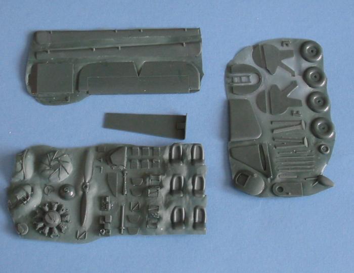 Die dunkelgrünen Großbauteile sind sehr stabil (und damit verzugsfrei) als Vollmaterial ausgeführt, wobei der Kabinenbereich ausgehöhlt ist. Angüsse sind hier nicht zu finden und das Material wirk fast "plastikartig". Eine erste Passprobe verlief sehr positiv, obwohl natürlich etwas gespachtelt werden muss! ich habe auch gleich die Schleiffähigkeit des Materials getestet: sehr gut!