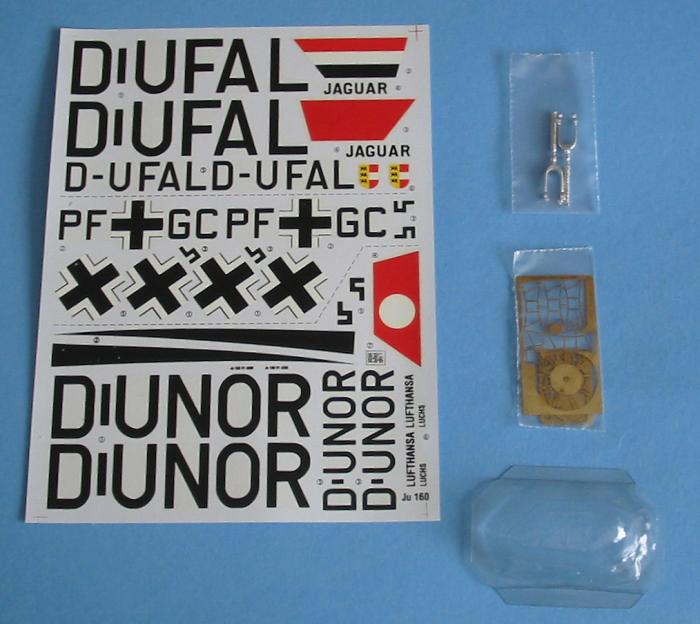 Die Kleinteile sind in eine Haut eingegossen und wirken sehr filigran. Lubomir Vesely hat hier sehr gute Arbeit geleistet. Nun zu den Teilen, die man hier eigentlich nicht erwarten konnte. Dem Bausatz liegt eine (leider nur eine) Vaku-Kanzel bei. Die Fahrwerksbeine sind aus Weißmetall gegossen und es finden sich sogar einige Ätzteile im Karton. Auch eine Bauanleitung und ein Bemalungsplan liegen bei und schließlich findet man einen großen Decalbogen auf dem Boden des Kartons (keineswegs eine Selbstverständlichkeit!).