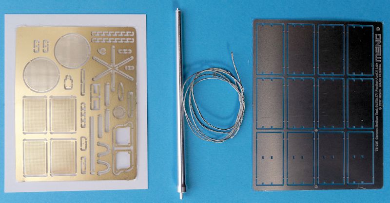 Bausatz: In einem großen stabilen Stülpkarton befinden sich neben der Bauanleitung und einer farbigen Klappfarbkarte insgesamt sieben Spritzlinge in Rot, drei in Schwarz, einer mit Klarsichtteilen, ein Aluminiumrohr, Polycaps, verdrillter Metalldraht in zwei Stärken, zwei Ätzplatinen sowie ein Abziehbilderbogen.