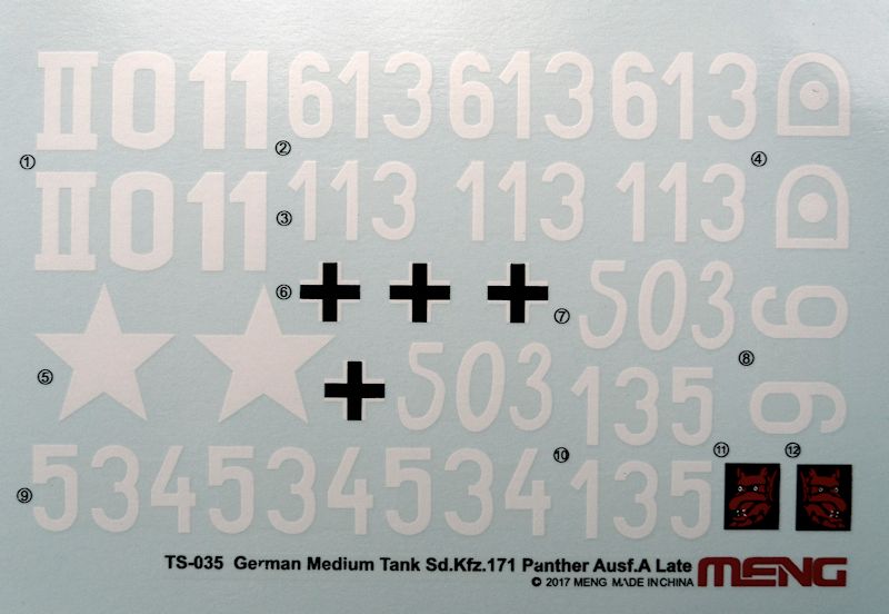 Fazit: Meng hat mit diesem Bausatz ein tolles Modell dieses berühmten Panzers auf den Markt gebracht. Die Detaillierung ist wirklich hervorragend, leider jedoch teilweise, durch viele Kleinstteile, über das Ziel hinausgeschossen. So ist die Montage der Ketten wirklich etwas für Puristen, die auch über eine Ausbildung als Uhrmacher verfügen. Das Produktionslos des Panther A erfordert, zwingend, eine Zimmeritbeschichtung für die Meng unter den Bestell-Nummer: SPS-50 bis 53 vier verschiedene Muster dieser Beschichtung in separat käuflichen Decalbogen auf den Markt gebracht hat. Wer das Fahrzeug mit beweglichem Laufwerk ausstatten möchte muss unter der Nummer: SPS - 049 dieses separat erwerben. Man kann somit auch durchaus damit rechnen, dass noch ein Motor oder Innenraum Set, als Zusatzteil, auf den Markt kommt. Für die Hersteller eine Bereicherung ihres Sortiments und für uns als Modellbauer die Möglichkeit gute Bausätze für einen günstigen Grundpreis zu bekommen ohne mit teuren und nicht benötigten Teilen überfrachtet zu werden. Für den erfahrenen Modellbauer sehr empfehlenswert.