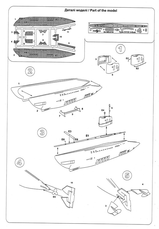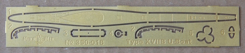Das Modell: Mikro Mir präsentiert uns hier einen wahren Winzling. Knapp 12 cm ist wirklich nicht viel für ein U-Boot in diesem Maßstab und in Ermangelung irgendwelcher externer Bewaffnung oder sonstiger hervorstechender Merkmale, kommt dieses überaus glatte Modell mit gerade mal mit 8 Plastikteilen aus. 8 Ätzteile vervollständigen den Bausatz. Zu diesen gehört auch der Propeller, und der ist in seiner Form nicht sehr gelungen. Die am Turm entlang laufende Reling wird den Gesamteindruck sicher heben und auch das geätzte Deck mit seinen diversen Zugangsklappen ist eine willkommene Ergänzung. Die drehbare Flosse auf der Back liegt ebenfalls als Ätzteil bei und ist dadurch natürlich flach, anstatt ein leichtes Profil aufzuweisen, aber dies ist in dem Maßstab und bei der geringen Größe akzeptabel.
