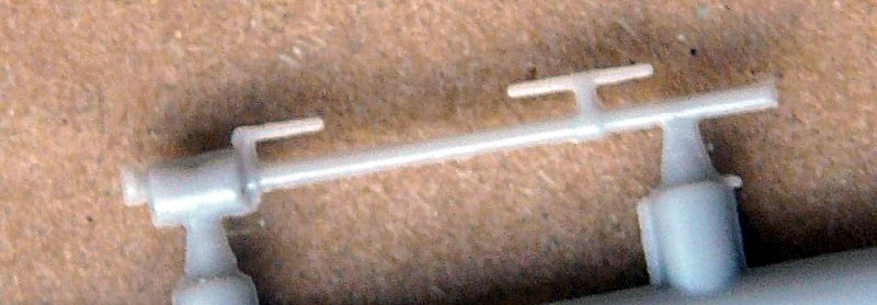 Periskope gibt es gar nicht und der Schnorchelmast ist wohl formbautechnisch nicht in den Griff zu kriegen gewesen. Ein Schnorchel besteht aus einem vorderen Zuluft- und einem hinteren, dünneren Abgasmast. Das Bauteil sieht so aus, als ob es einen dünneren Abgasmast hatte geben sollen, dieser aber einfach nicht vollständig zu spritzen war. Die beiden "Fragmente" sehen zwar irgendwie "gewollt" aus, so als ob sie Antenne, oder ähnliches darstellen sollen, aber das ist Quatsch. Immerhin hat man versucht, die Runddipolantenne Bali I oben auf dem Ringschwimmer-Schnorchelkopf darzustellen. Löblich!