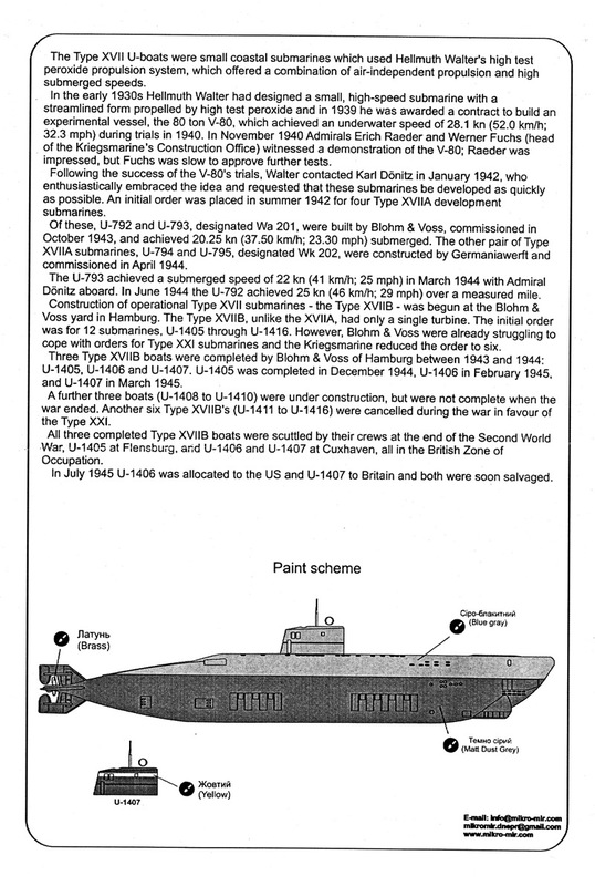 Die Ergebnisse der Versuche mit diesen Booten führte trotz diverser ungelöster Probleme zu einem Bauauftrag seitens des OKM über 24 Kampfboote mit der Bezeichnung Typ XVIIB. Blohm & Voss sollte die ersten 12 Boote bauen, war aber durch den Bau der Typ XXIer Boote schon am Rande seiner Leistungsfähigkeit angelangt, so dass die Anzahl auf 6 reduziert wurde. Tatsächlich wurden nur drei Boote ( U 1405, 1406 und 1407) zwischen Dezember 1944 und März 1945 fertiggestellt. Alle Boote wurden bei Kriegsende selbst versenkt. Lediglich U 1407, das man in Potsdam den Briten zugeschlagen hatte, wurde nicht nur gehoben, sondern auch repariert und als HMS Meteorite für die Royal Navy erneut in Dienst gestellt. Die Briten bauten auf Basis dieses Bootes sogar noch zwei eigene Versuchsboote (Explorer und Excalibur), jedoch wurde die Entwicklung eines britischen "Walter-Ubootes" zu Gunsten des Atomantriebs beendet. Rückblickend betrachtet konnten die Kriegsgegner des 3. Reiches wieder mal froh sein, dass bahnbrechende Ingenieurleistungen von den eigenen Stellen nicht rechtzeitig erkannt wurden.