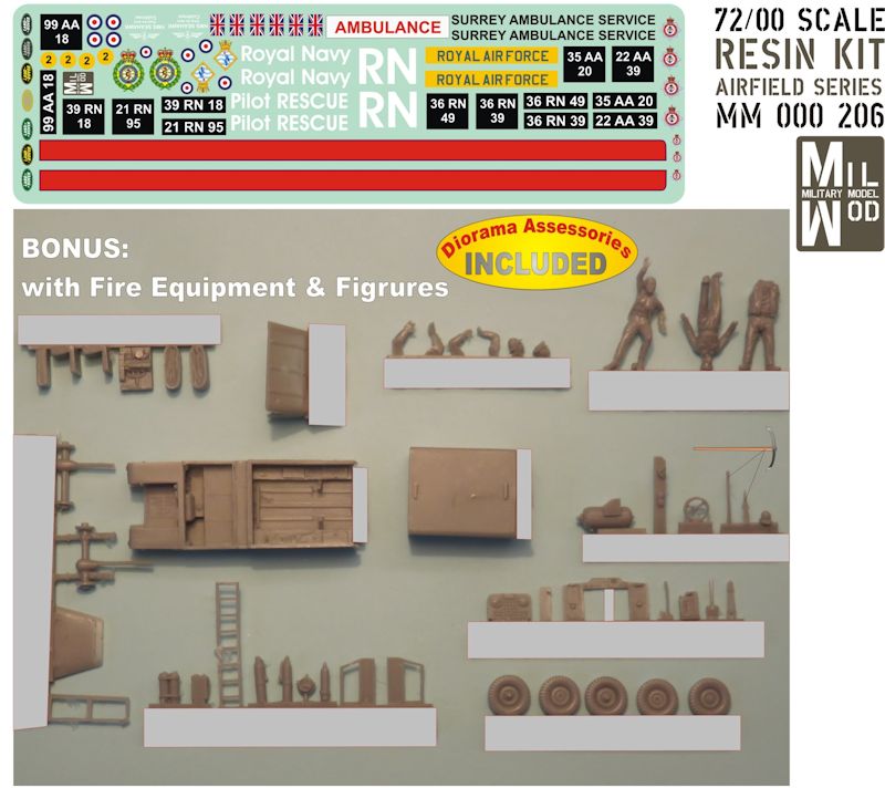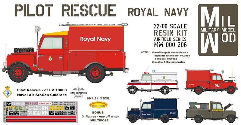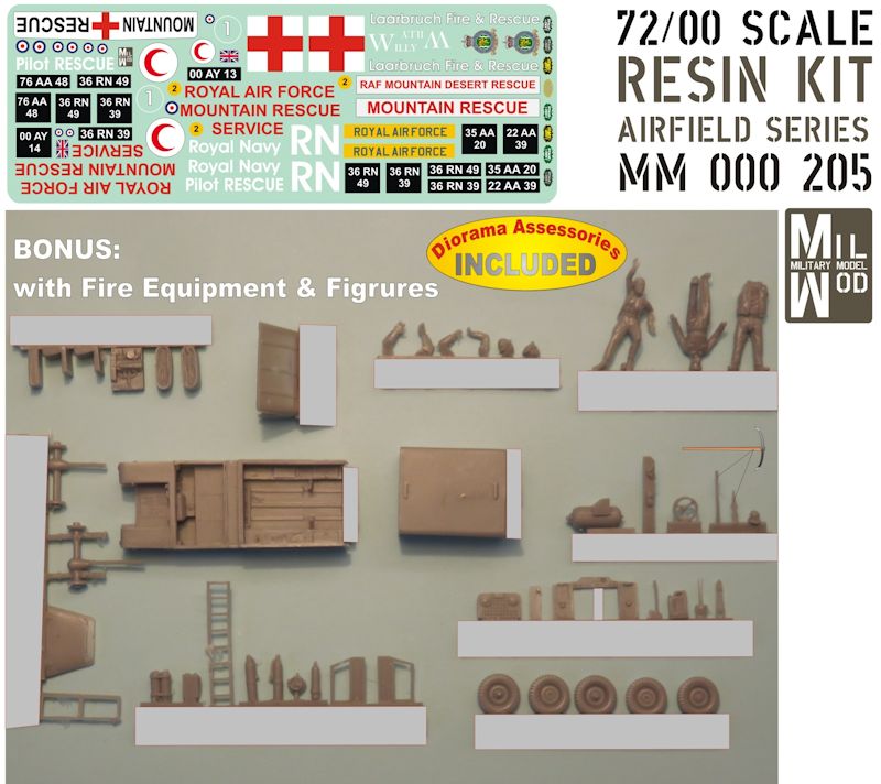 Vorbild: Beim Vorbild der beiden Kits handelt es sich um einen speziellen Royal Navy Crash Tender mit der Fighting Vehicle (FV) Number 18003. Das ist ein Land Rover Srs I, 107 In LWB. Er basiert auf der Navy-Ausschreibung für ein Vorauslöschfahrzeug zur Pilotenrettung - first response vehicle - auf den Basen der Fleet Air Arm. Das Konzept hat dann auch die RAF übernommen, die sogar einen "dritten Mann" hinten in einer überdachten Sitzbox unterbrachte. Basis waren mitgeführte Feuerwehrausstattungen um Piloten schnellstmöglich aus einem brennenden Cockpit zu befreien. Dazu wurden nicht nur Leitern und schweres Gerät wie die an der Stoßstange griffbereit angebrachte Rodehacke mitgeführt, sondern auch alle drei möglichen Löschmittel, nämlich CO2, Schaumlöscher und Trockenlöscher - das Ganze dann in XL - also etwas größer als normale Handlöscher auf der Ladefläche verstaut. Als besonders schneller Zugang zu den in Not geratenen, war auch der Weg über Stoßstange, Motorhaube, Dach und erhöhtem/stabilen Aufbau vorgesehen.