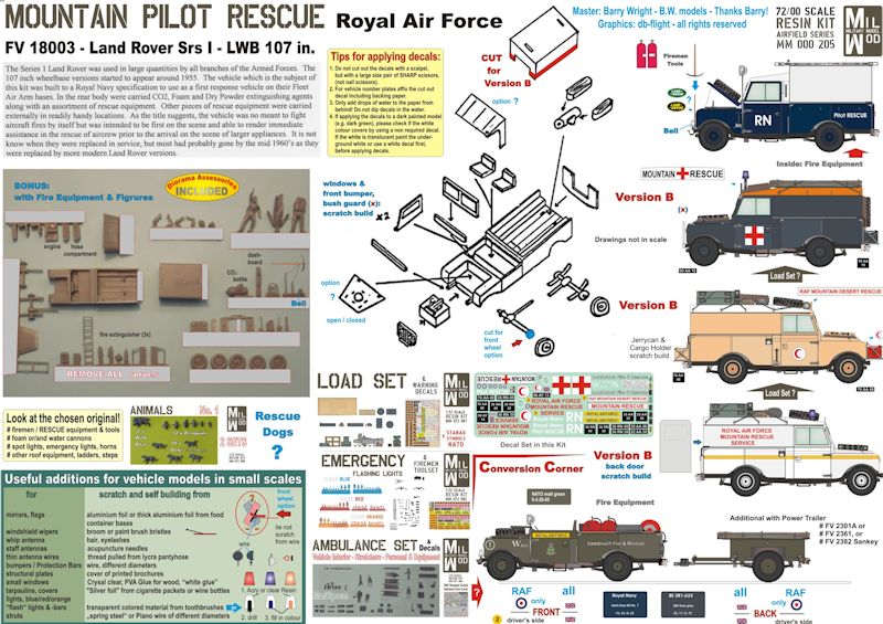 Bemalung: Interessant sind natürlich die Mountain Rescue und RAF Mountain Desert Rescue Bemalungen, für die allerdings das eine oder andere Zubehör selbst gebastelt werden und/oder den MilMod Zubehör-Sets entnommen werden muss. Die möglichen militärischen oder zivilen Bemalungsvarianten kann man hier den Fotos der Instruktionen und der Cover entnehmen. Natürlich sind das auch immer Anregungen für eigene Gestaltungen. Im Internet findet man viele interessante Geschichten zu diesen Spezialeinheiten zur Rettung von Besatzungen aus unwegsamen Gebieten - früher sogar überall auf der Welt.