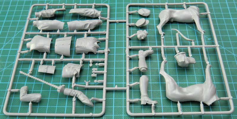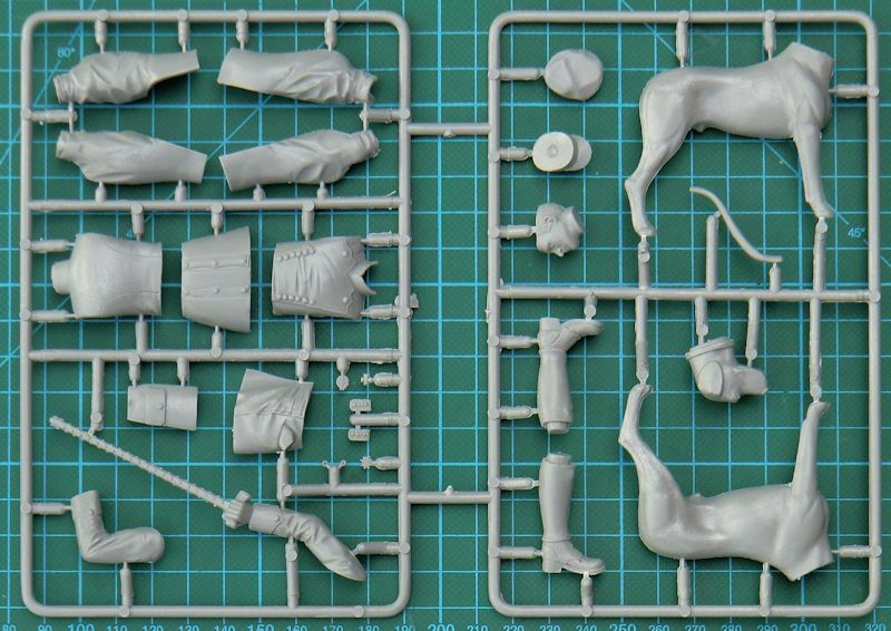In einem praktischen Stülpkarton befinden sich gut verpackt ein grauer Spritzling mit 25 Teilen und einem standardisierten braunem Sockel sowie eine A5-Bauanleitung. Die Abspritzung der Bauteile ist sehr ordentlich und auch der Faltenwurf geht in Ordnung. Da der Pilot aus mehreren Teilen zusammengesetzt wird, bleibt die Nacharbeit sicherlich nicht aus. Leider wird von Richthofen nicht gemeinsam mit seinem Hund auf den Sockel passen.