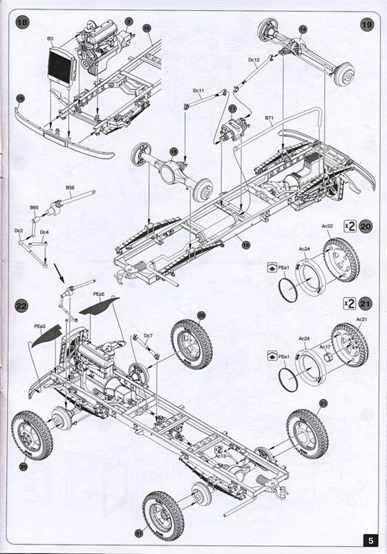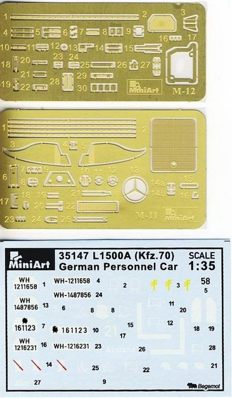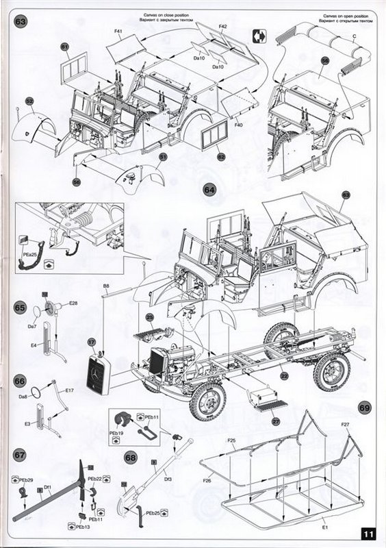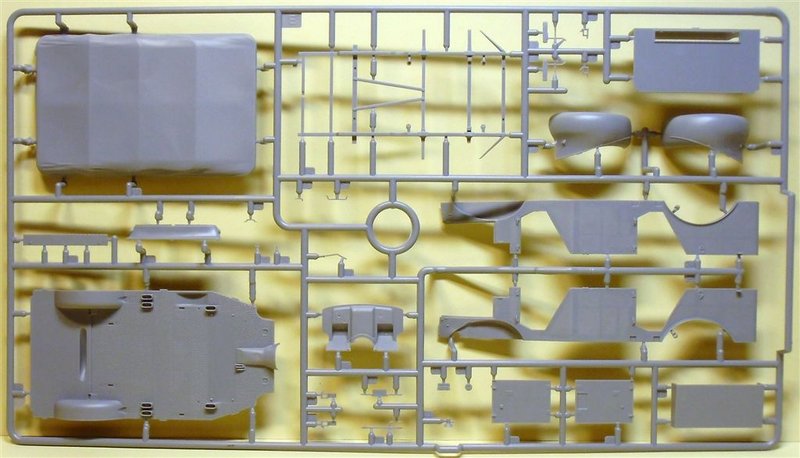 Der Modellbauer hat bei der Kühlermaske die Möglichkeit die vorhandene vollständige aus Plastikspritzguss, oder aber eine zweite beiliegende mit Ätzteilen zu versehende, zu verwenden. Die Motorhaube sowie die Türen am Fahrzeug können geöffnet oder geschlossen dargestellt werden. Für die Befestigung der Werkzeuge und Zubehör sind Ätzteile vorhanden.