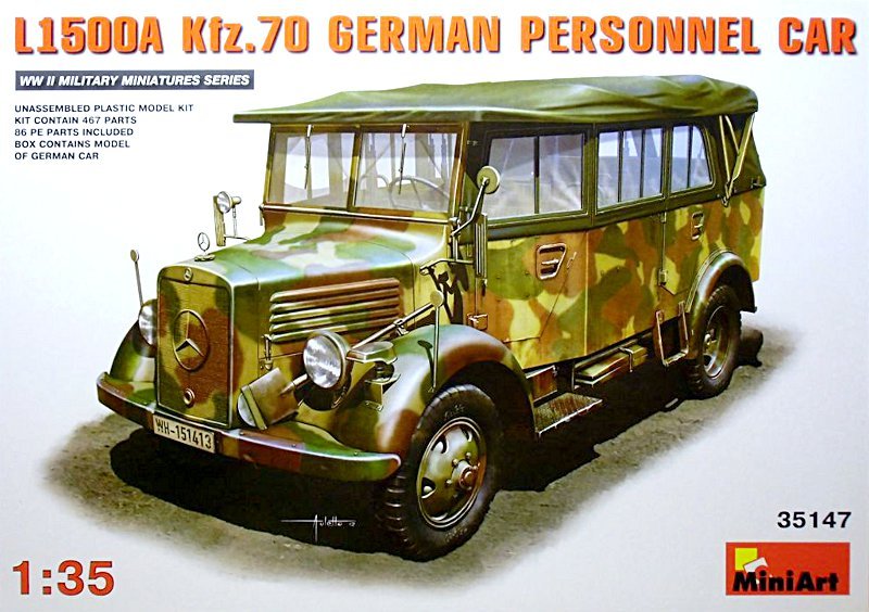 Zum Modell: Als aktuelle Neuheit in der 1:35 WWII Military Miniatures Serie hält der ukrainische Plastikmodellbau Hersteller MINIART einen Mercedes-Benz L1500A parat. Lange hat es gedauert bis ein Plastikmodell Kit vom MB L1500A auf dem hiesigen Modellbaumarkt verfügbar war. Nun gibt es gleich zwei osteuropäische Herstellen die uns das Modell bescheren. Von ICM erschien der Bausatz etwas früher als von MINIART. Der Kit von ICM unterscheidet sich vom MINIART Bausatz geringfügig in der Frontpartie und den Felgen und dem fehlen des Verdecks, von der Detaillierung und der Teileanzahl liegt der L1500A von MINIART aber deutlich vor dem ICM Kit.