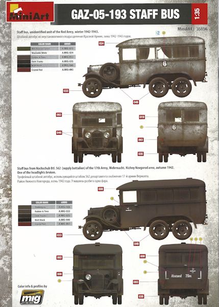 Bemalungsvarianten: Die Abziehbilder sind sauber und randscharf gedruckt. Die Bemalungsanleitung, bezogen auf das Farbensortiment von Mig, gibt vier darstellbare GAZ-05-193 an.