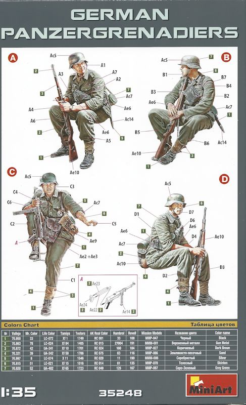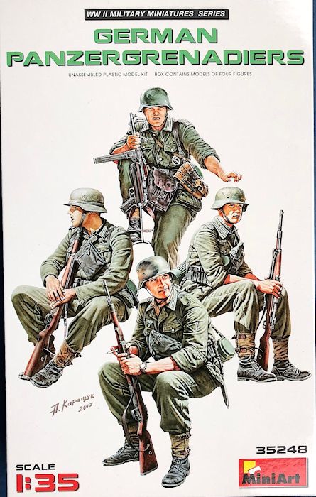 Im üblichen Faltkarton bietet Miniart vier deutsche Panzergrenadiere in sitzendenden Positionen. Bereits das Deckelbild hat mich überzeugt mir diesen Bausatz zu kaufen. Sofern die Figuren dieser gelungener Illustration ähneln, lohnt sich die Anschaffung.