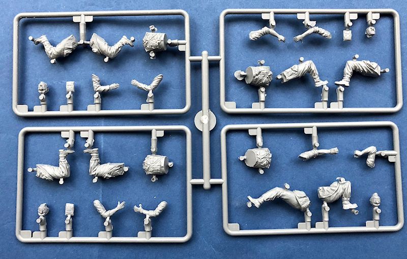Beim Öffnen des Kartons findet man vier Gussäste in grauem Plastikspritzguss, von denen sich einer den Hauptteilen der vier Figuren widmet. Diese machen einen guten Eindruck, aber im Vergleich zu den inzwischen als "High Tech" zu bezeichnenden Figuren von Tamiya und Dragon wirkt die Detailschärfe der "Geschirre" und Gürtel doch eher enttäuschend. Die Köpfe sehen ganz brauchbar aus, aber auch hier fehlt mir der letzte Schliff.