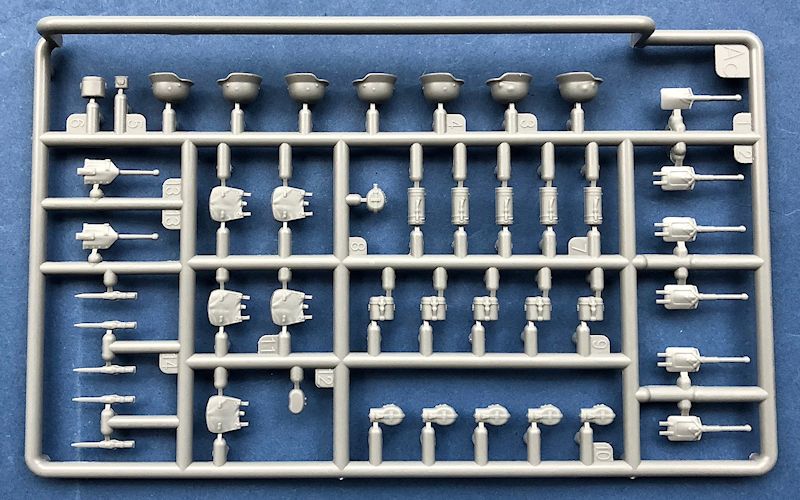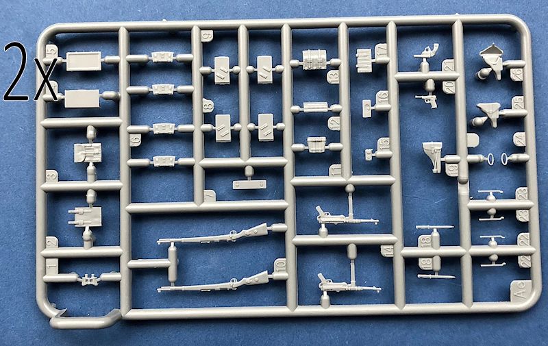Auf zwei weiteren identischen Gussästen findet man Waffen und Ausrüstungsgegenstände die wiederum hervorragend aussehen. Diese scheinen auf dem aktuellsten Stand zu sein und stammen wahrscheinlich von einem der neuesten Figuren oder Detail Sets. Nicht so schön finde ich, dass hier die Patronentaschen für die K98 absolut plan ausgeführt sind und somit einer Nachbehandlung bedürfen, wenn man diese an den Figuren anbringen will (biegen und feilen). Als absolut perfekt kann man aber die Karabiner, Pistolen und Pistolentaschen bezeichnen. Hut ab!