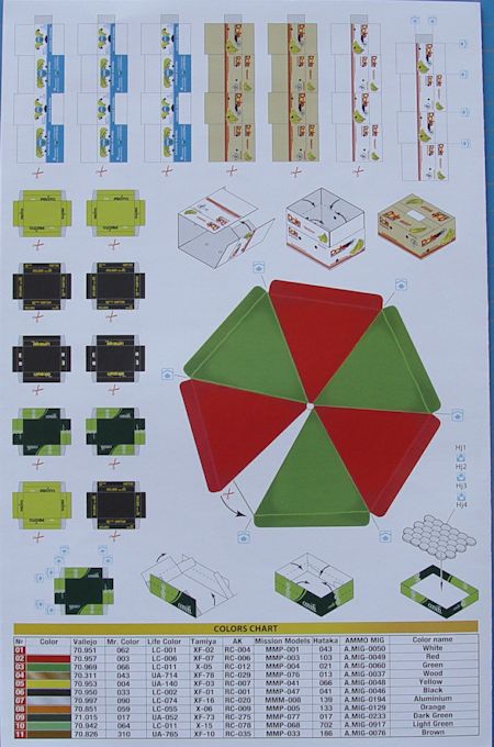 Bemalung: Die Bauanleitung besteht aus vier Seiten und ist übersichtlich gehalten. Sie gibt auch Hinweise auf die Farbgestaltung, man kann auf Farben aus acht Systemen zugreifen. Des Weiteren gibt es noch auf Papier gedruckte Standdeko.