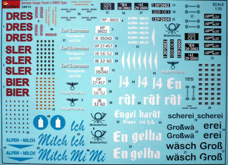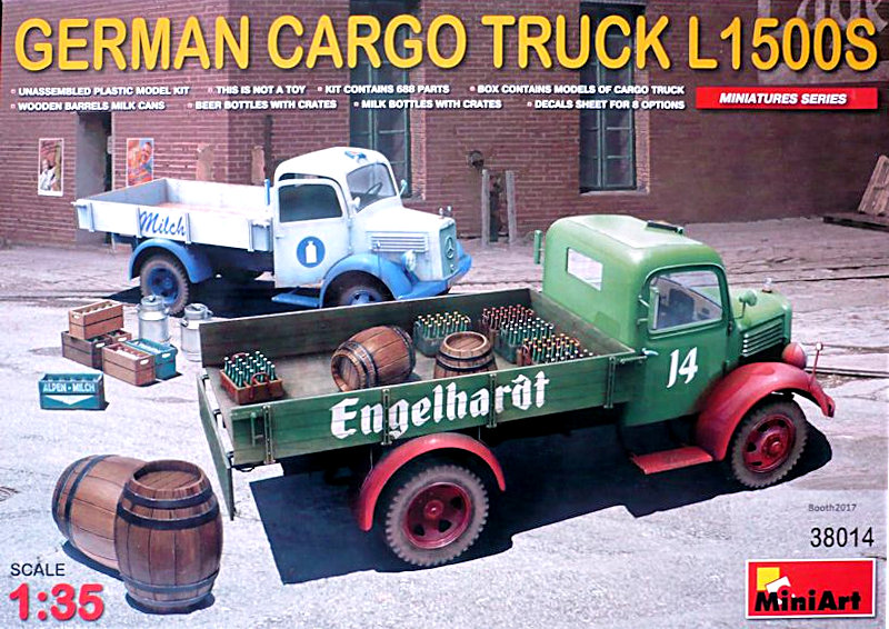 Bausatz: Man nehme den alten bekannten L1500S Militärlaster (35142) und packe Fässer, Milchflaschen und Bierflaschen aus den Zubehörpackungen dazu - fertig ist ein neuer Bausatz im zivilen Kleid. Dieser besteht aus insgesamt 688 Teilen, verteilt auf zwölf graufarbigen Plastikspritzgussrahmen, einer losen Fahrerkabine, dreizehn Gussrahmen mit Klarsichteilen, zwei Ätzteilbögen und einem reichhaltigen Abziehbilderbogen.