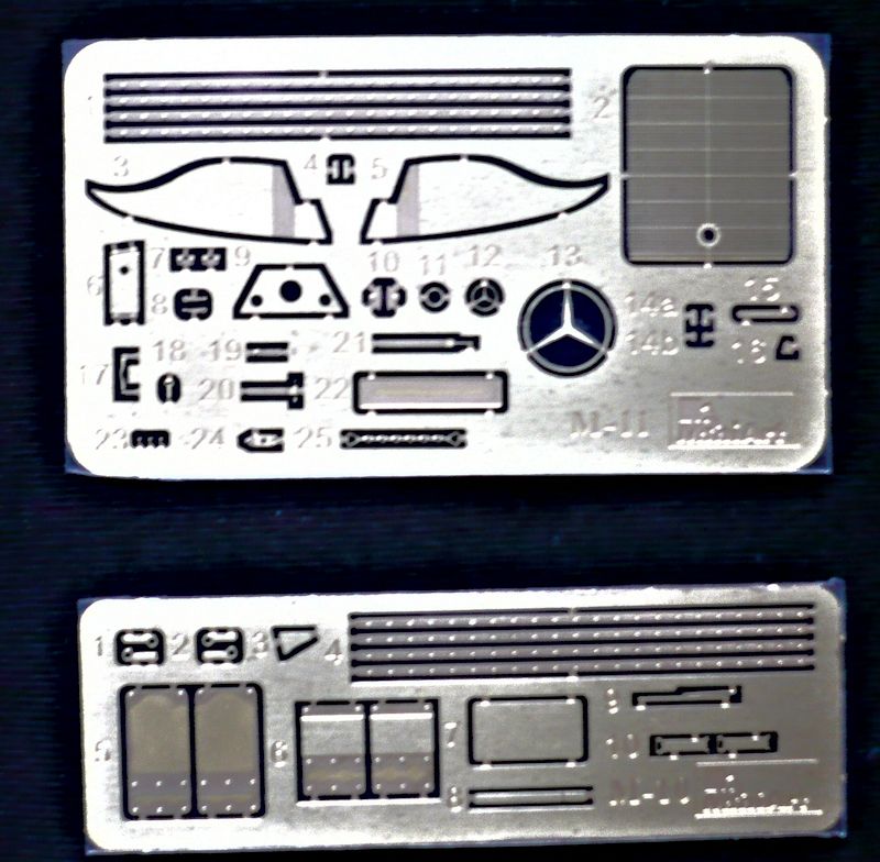 Die beiden absolut ausreichenden Ätzteilbögen dienen unter anderem der Wiedergabe von Beschlägen am Aufbau, Kühlergrill, MB-Stern und Scheibenwischer.