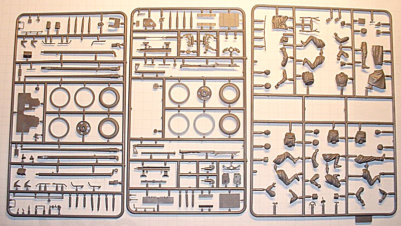 Das Rohr besteht aus zwei Plastikteilen. Ebenso die Holme der Lafette. Das Schild ist sehr dünn, es befindet sich aber eine Auswerferstelle genau in der Mitte der Rückseite des Schildes. Der Verschluss und auch andere Kleinteile sind sehr schön wiedergegeben. Die Räder sind komplett aus Plastik. Das Profil ist gut wiedergegeben. Es sind auch 12 Granaten und 4 Hülsen dabei. Bei den Granaten sind es 3 verschiedene Typen. Die Hülsen muss man allerdings aufbohren.