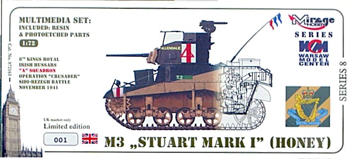 Der M3 hatte als Hauptbewaffnung eine 37 mm M5 Kanone, die durch ein koaxiales Kaliber .30 MG ergänzt wurde. Dazu kamen auf dem Turm ein weiteres MG und vorn neben dem Fahrer noch ein in Kugellafette eingebautes MG. Im Juni 1941 erreichten die ersten M3 Ägypten z.T. via Großbritannien und auch direkt aus den USA. Dementsprechend waren sie in US Olive Drab (FS34087) oder Middle Bronze Green (BSC23) lackiert. Schnell wurden die Panzer mit einer neuen Lackierung versehen, die deren Silhouette brechen sollte. Der Anstrich bestand dann aus Portland Stone (BSC64), Light Stone (BSC61), Silver Grey (BSC28) und Slate (BSC34). Viele Panzer wurden auch einfach nur zweifarbig (Light Stone und Slate) bemalt. Während der Kämpfe im November /Dezember 1941 gingen auf britischer Seite ca. 800 Panzer verloren.
