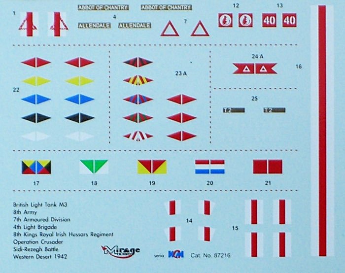 Ob die Gummikette der große Hit ist, dass wird sich zeigen. Zweifellos ist sie von innen und außen gut detailliert. Mit dem Vinylseil kann ich mich aber gar nicht anfreunden. Da gibt es im Zubehörmarkt Ersatz oder man stellt sich selbst ein Seil her. Für die Schürzen und die Staukästen sind Fotoätzteile vorhanden, die das Modell sichtlich verfeinern können und es zum Schmuckstück werden lassen können. Der Decalbogen ist für solch ein kleines Fahrzeug sehr umfangreich und enthält sogar die kleinen Fähnchen, die an der Antenne befestigt waren. Die Bemalungsanleitung ist als vorbildlich zu bezeichnen. Für die Zukunft hat Mirage HOBBY auch noch die späteren Versionen des M3 Stuart geplant.