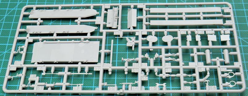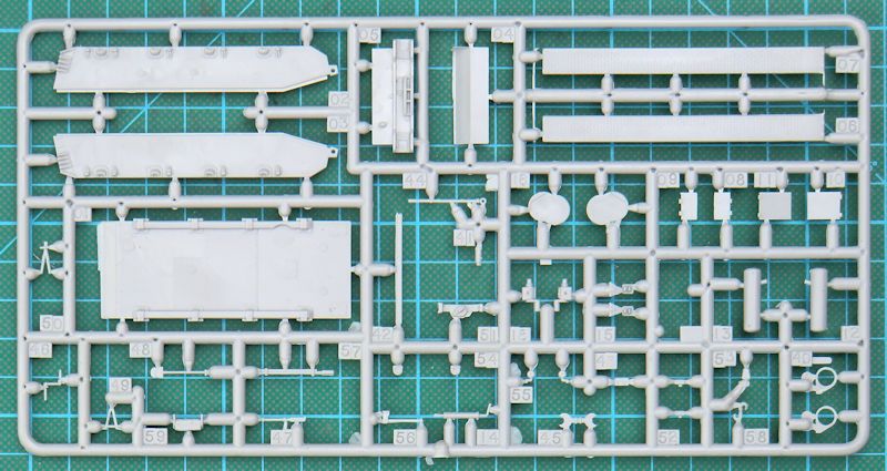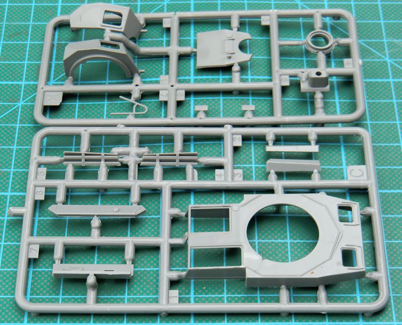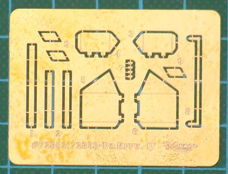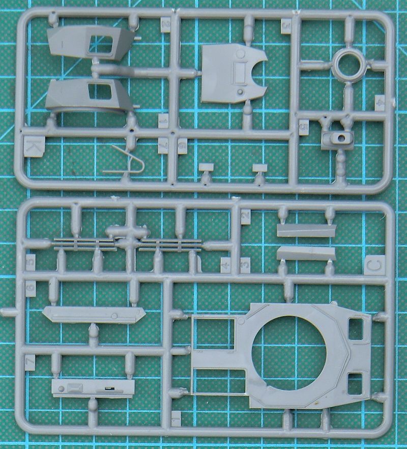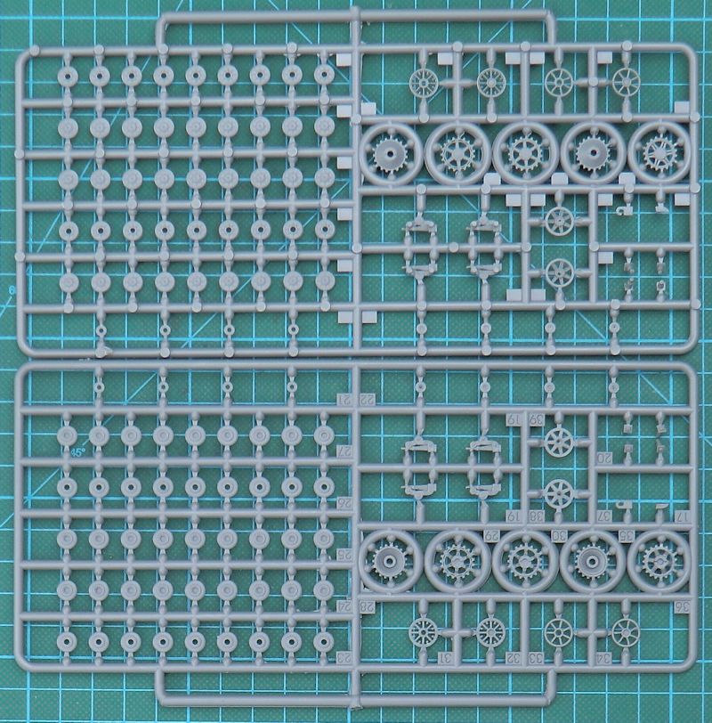 Bausatz: Seit fast zehn Jahren ist der frühe Pz.Kpfw. IV in 1/72 bei Mirage auf dem Markt. So sind modifizierte Auflagen dieses Bausatzes sehr willkommen. In der attraktiven aber unpraktischen Schüttbox befinden sich gut verpackt sechs graue Spritzlinge mit insgesamt 238 (!) Einzelteilen, vier schwarze Vinylteile, eine kleine Fotoätzteilplatine, ein kleiner Decalbogen und die Bauanleitung. Die Teile sind in unterschiedlicher Qualität. Die etwas helleren Teile für die Wanne sowie die Kleinteile sind leicht verwaschen und mit Einsenkungen versehen. Die meisten Teile werden für das Fahrwerk, insbesondere für die Rollen, benötigt.