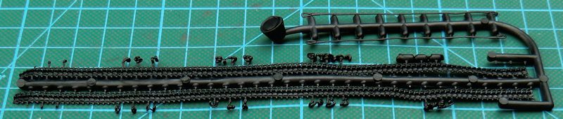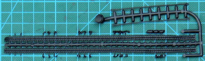 Durch die vielen kleinen Anbauteile wird es zwar etwas mühsam aber das einzeln angebaute Werkzeug sieht einfach besser aus. Zwei Teile als Vinyl sollen als Drahtseile dienen. Hier gibt es besser in Form zu bringende Alternativen aus Draht. Die Vinylketten sehen gut aus. Bei der Verarbeitung gibt es die verschiedenen Möglichkeiten.
