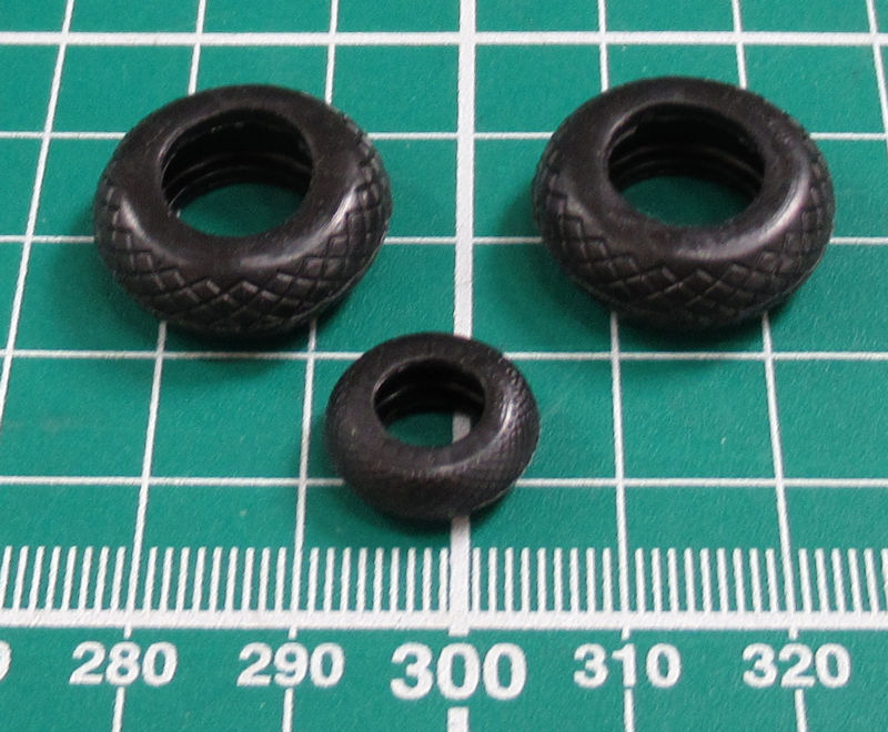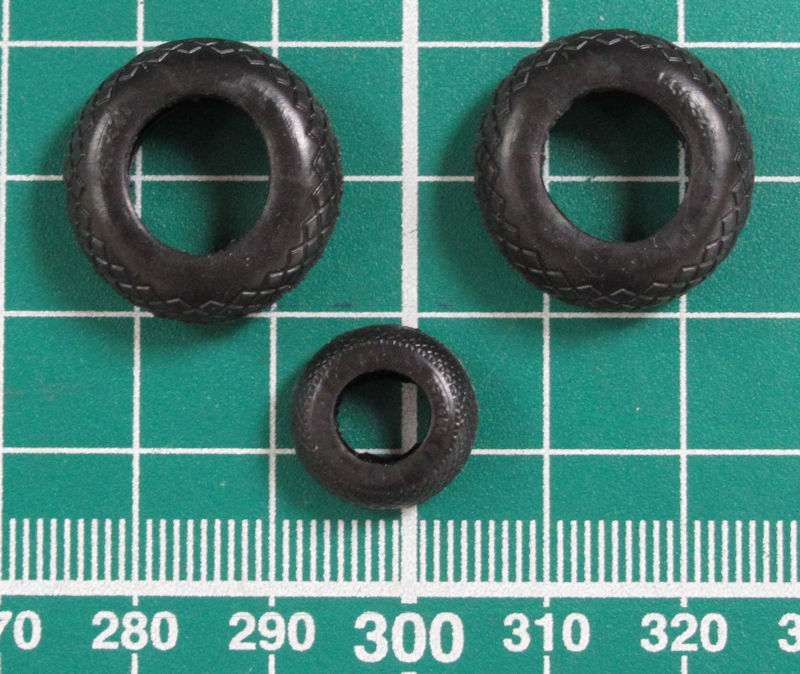 Der Bau beginnt mit dem Cockpit. Dieses ist sehr gut ausgestattet. Für das Instrumentenbrett und die Bedienungskonsolen gibt es Decals. Ein paar Sitzgurte kann man noch ergänzen. Von außen ist aber später nicht sehr viel davon zu sehen. Die Gummireifen werden schon in den Bauschritten 8/9 auf die passenden zwei Hälften der Felgen gezogen. Sie haben zwar ein schönes Profil. Nachteilig ist immer der mit Weichmacher behaftete Gummi…