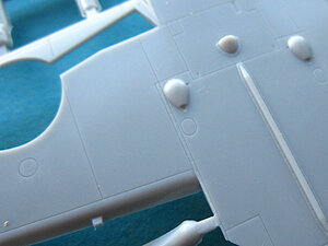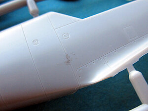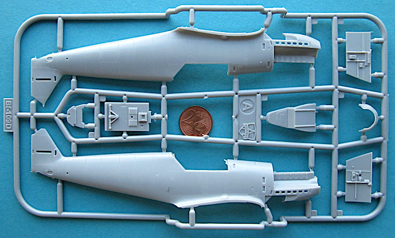 Die Außendetaillierung ist eher konservativ. Es gibt sehr feine Gravuren aber keine Nietenreihen. Alle Steuerflächen liegen separat bei! Diese und die Finnen des Höhenruders sind einteilig, also kein Sandwich aus Ober- und Unterseite. Trotzdem gibt es keine Sinkstellen! Die Lüftungsschlitze am Rumpf scheinen alle an den richtigen Stellen zu sein. Die obere Linie der Motorhaube/MG-Abdeckung fällt für meinen Geschmack ziemlich stark ab. Ich hab aber noch nicht raus ob das eine optische Täuschung wegen des Motorimmitats ist. Der Bau wird es zeigen. Gespannt bin ich auch, ob die Abstrebung des Höhenleitwerks lang genug ist. Bei den meisten Bf 109E-Bausätzen sind diese ein wenig kurz geraten.