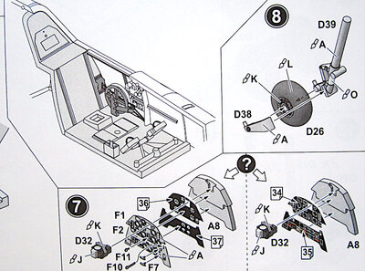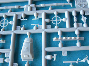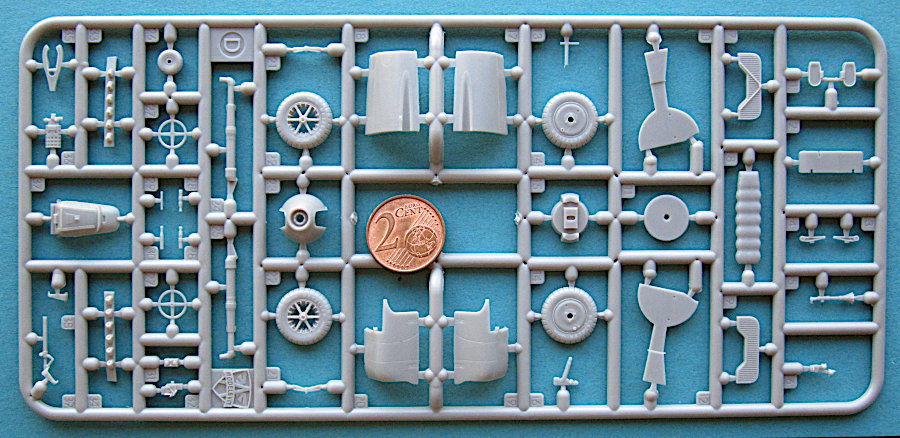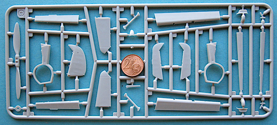 Der Bausatz besteht aus 4 grauen und einem klaren Gießrahmen. Die Spritzlinge sind vergleichsweise klein und die Teile sind eng darauf verteilt. Es ist also ratsam für das Heraustrennen eine PE Säge oder etwas Ähnliches zu benutzen, mit dem man auch auf engem Raum hantieren kann. Die Detaillierung der Teile ist sehr ordentlich! Es gibt auch einen kleinen Ätzteilbogen für feinere Details, die Gurte und das Instrumentenbrett. Letzteres ist als Sandwich von Plastikteil Decal und Fotoätzteilen aufgebaut. Die Instrumentendecals liegen noch zweimal als Reserve bei.