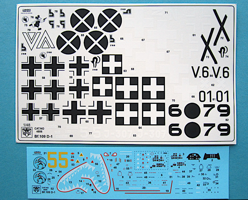 Wie schon erwähnt gibt es 6 Bemalungsvarianten. Die Decals sind dafür auf zwei Bögen gedruckt: ein schwarz-weißer und ein farbiger. Der Druck von Dekograph aus der Ukraine ist völlig versatzfrei. Insbesondere die Propellerlogos und die Oktandreiecke überzeugen! Die Anwendung muss natürlich noch zeigen, ob die Nassschiebebilder wirklich zu gebrauchen sind.