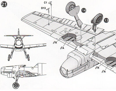 Die Bauanleitung ist etwa A4 groß und 12 Seiten stark. Die Hälfte davon entfällt auf die vierseitig dargestellten. Seite 1 enthält einen kurzen historischen Abriss und die Farbenzuordnung (GSI Mr. Color, AK Real Color und generische Farbangaben bzw. RLM Farben). Die zweite Seite zeigt den Bausatzinhalt im Überblick. Hier gibt es auch eine kleine Hilfestellung für das Anbringen der Vinylmasken. Diese sind von Oracover scheinen aber nicht vom ganz billigen Typ zu sein, da sie sich noch nicht zusammengezogen haben. Die restlichen 4 Seiten zeigen den Zusammenbau in 23 Baustufen. Die isometrische Darstellung scheint computergeneriert zu sein und ist nur im Bereich des Cockpits leicht unübersichtlich. Sehr gut gefällt mir die Darstellung der angebrachten Fahrwerksbeine. Diese sind von vorn und von der Seite zu sehen, so dass man einen Vergleich für die Winkel hat, top!