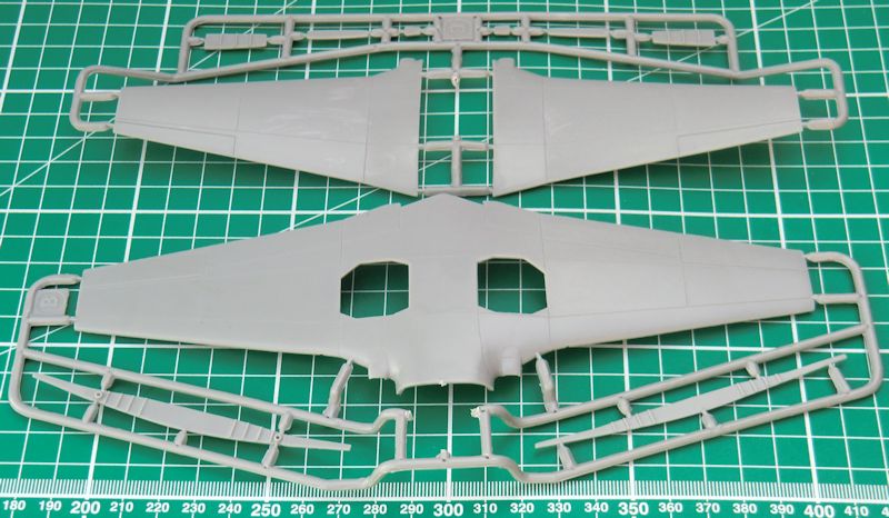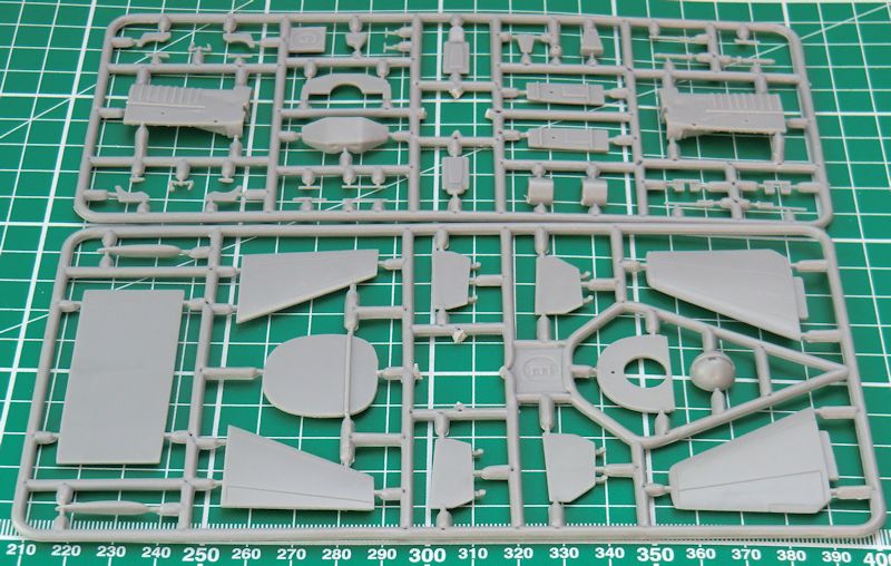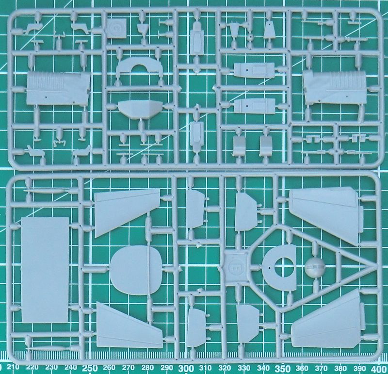 Bei den Bauteilen ist man natürlich schnell an Amodel und Avis erinnert. Es gibt feine versenkte Strukturen und manchmal klobige Details. Im Cockpit gibt es eine recht ordentliche Ausstattung. Die Sitze sind etwas vereinfacht und die Instrumente werden mittels Decals dargestellt. Dafür gibt es aber Seitenruderpedale und Steuerhörner. 20g sollen im Rumpfbug als Gegengewicht eingebaut werden.