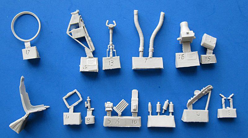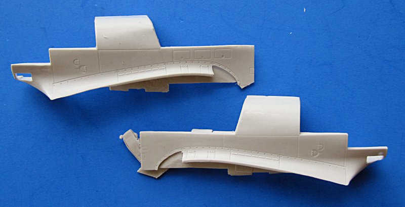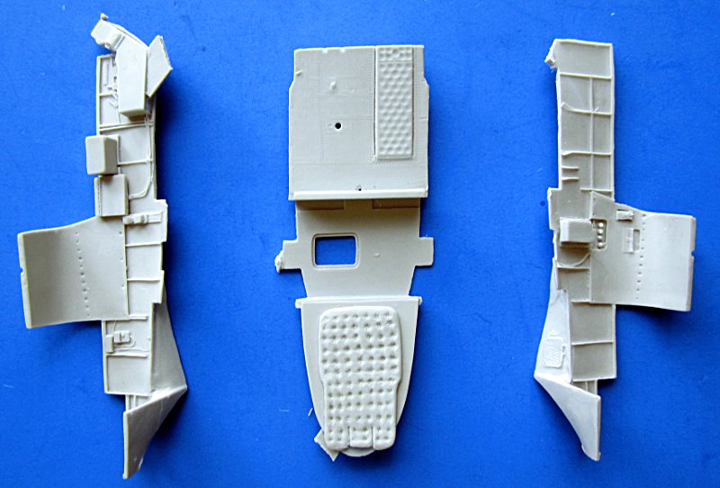 Nur wenige Teile des mittleren Rumpfes finden bei Verwendung dieses Satzes Platz am Modell. Die 3 großen Bauteile für die Seitenwände und den Boden werden auf dem Flügelmittelstück von GWH aufgebaut. Und auch im Inneren wird fast alles ersetzt. Der Guss der Resinteile ist ausgezeichnet und es gibt nirgendwo Gusslunker oder -löcher. Allerdings sind gerade die Großbauteile etwas verzogen und müssen gerichtet werden. Ob dies durch den Transport verursacht wurde oder schon vorher entstand kann ich nicht sagen. Der Karton ist ziemlich dünn und kam etwas zerbeult bei mir an, aber im Inneren waren ausreichend Schaumstoffflocken, um eine Beschädigung der Bauteile zu verhindern.