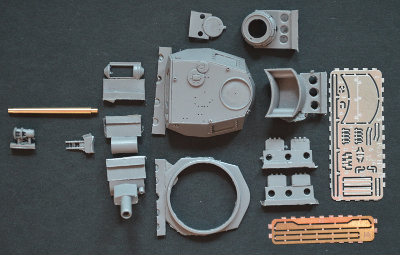 In dem stabilen Faltkarton befinden sich sicher verpackt 102 graue Resin- und 49 Metallteile sowie die Bauanleitungen für Turm und Wanne. Die Resinteile überzeugen durch ihre scharfen, deutlichen Details und weisen keine Blasen auf. Fischhäute sind einige vorhanden, die sich aber leicht entfernen lassen. Die langen Kettensegmente sind leicht verzogen, lassen sich aber in einem heißen Wasserbad korrigieren.