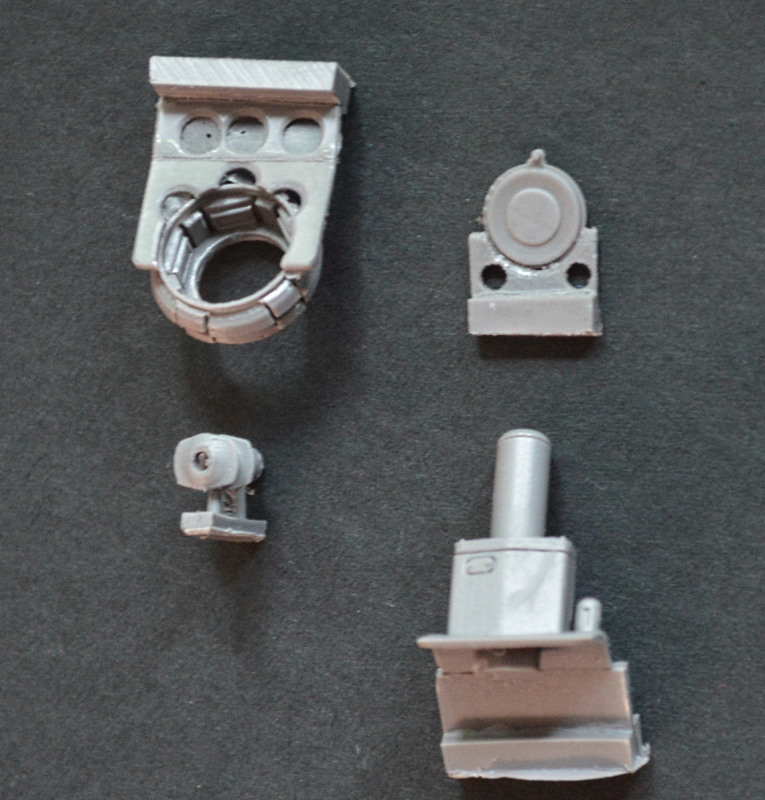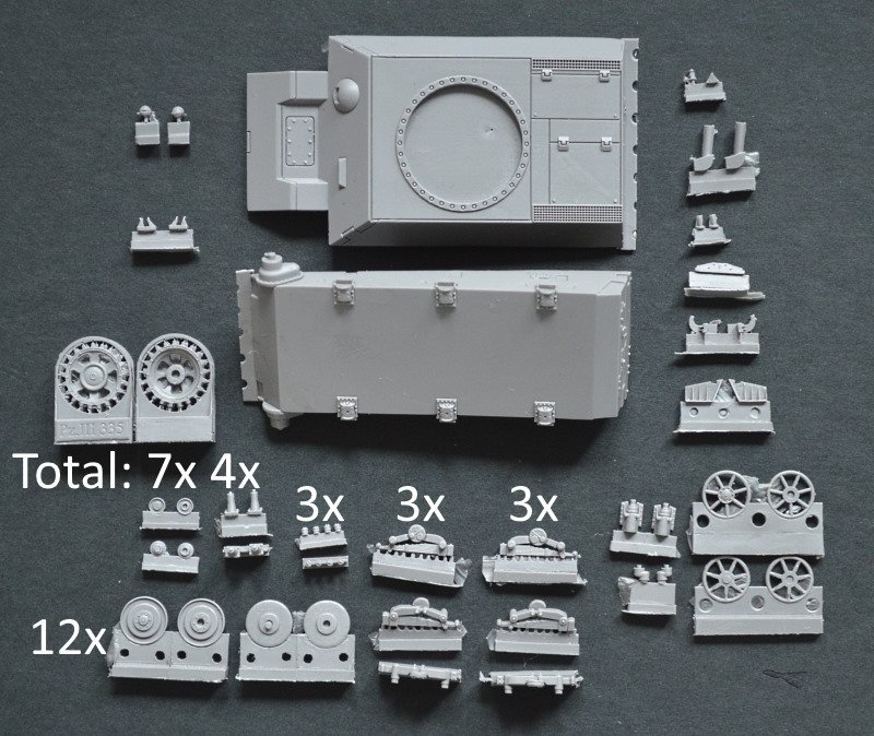 Im Fahrwerksbereich werden die meisten Teile benötigt, da hier wirklich alles detailgetreu wiedergegeben ist. Selbst die acht Endanschläge der Federung bestehen aus je einem zu faltenden Ätzteil und einem plastischen Resinteil. Am beeindruckendsten sind wohl die Triebräder, die jeweils in einem Stück gegossen sind, aber auch die Ketten sind fabelhaft wiedergegeben.
