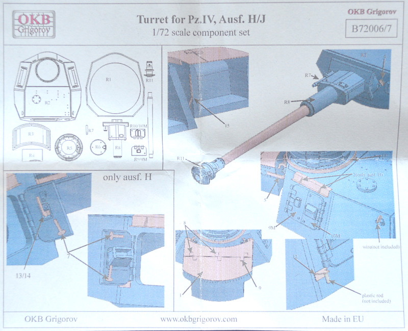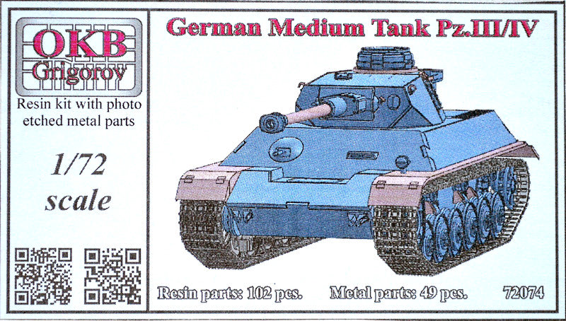 Bausatz: OKB Grigorov hat eine Reihe von Panzerprojekten und Panzertürmen in 1:72 realisiert. Hierzu gehört auch der Pz.Kpfw. IV auf Einheitsfahrgestell bzw. III/IV. Die so nie gebaute Wanne, wird hier mit dem Turm des Pz.Kpfw. IV Ausführung J angeboten.