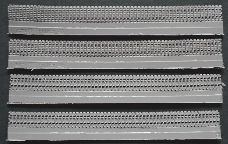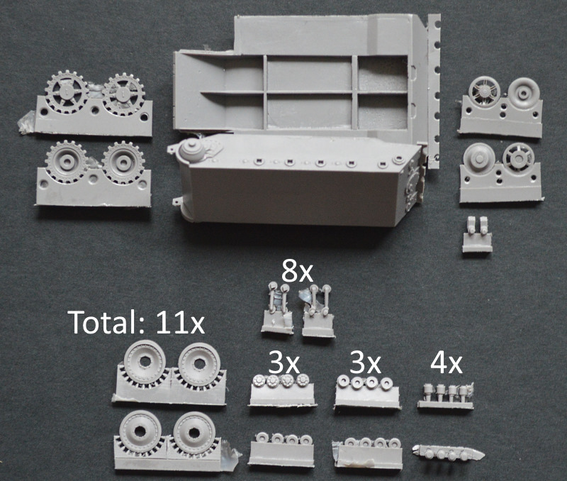 Im Fahrwerksbereich werden die meisten Teile benötigt. Die Trieb-, Leiträder und Laufrollen sind mehrteilig. Für die Laufrollen wurden die Schwingarme separat gegossen, wodurch sich mit ein paar Anpassungen das Laufwerk auch eingedrückt darstellen ließe. Die Ketten sind für OKB typisch: extrem fein wiedergegeben.
