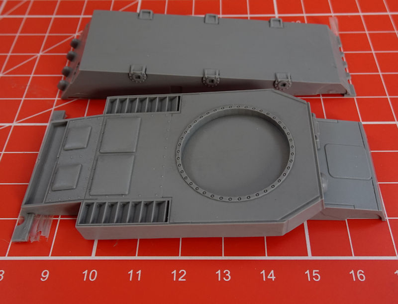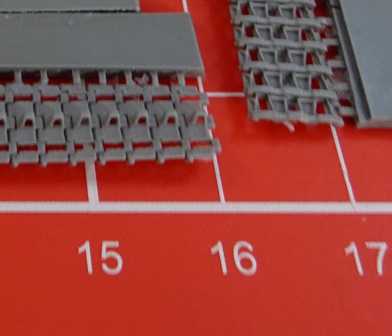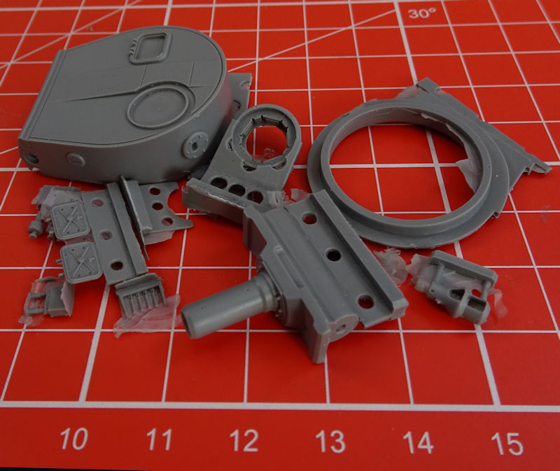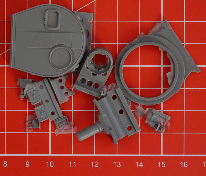 Der Resinguss ist tadellos und die Angüsse sind sehr gut sowie dünn ausgeführt. Das Abtrennen sollte ohne Probleme funktionieren. Die Kettenabdeckungen sind aus Metall und damit sehr dünn und fein. Der Turm ist zwar hohl aber die Kommandantenkuppel bleibt zu. Die Innereien wären ja eh fiktiv.
